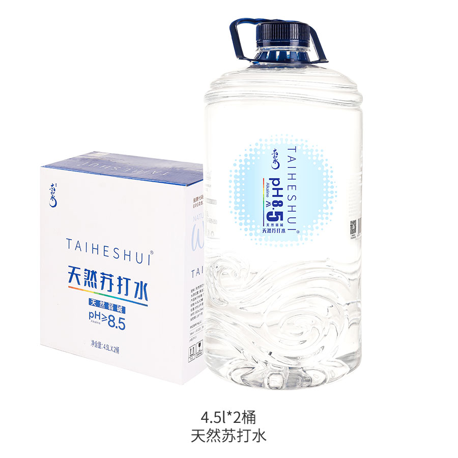 產商品编码称:TAIHESHUI-具有苏打水;產品的规格:4.5L*2桶;產品难点: 地下水地为全国五大冷泉之五的拜泉县具有苏打水庇护区; ph值范围8.5结合休内过高酸碱平衡性,稳定平衡休内酸碱平衡生态 具有小氧分子团水,人身体更易代谢,实现了急剧皮肤补水 丰富各种进样器的元素 酒质软滑,和气甘冽。